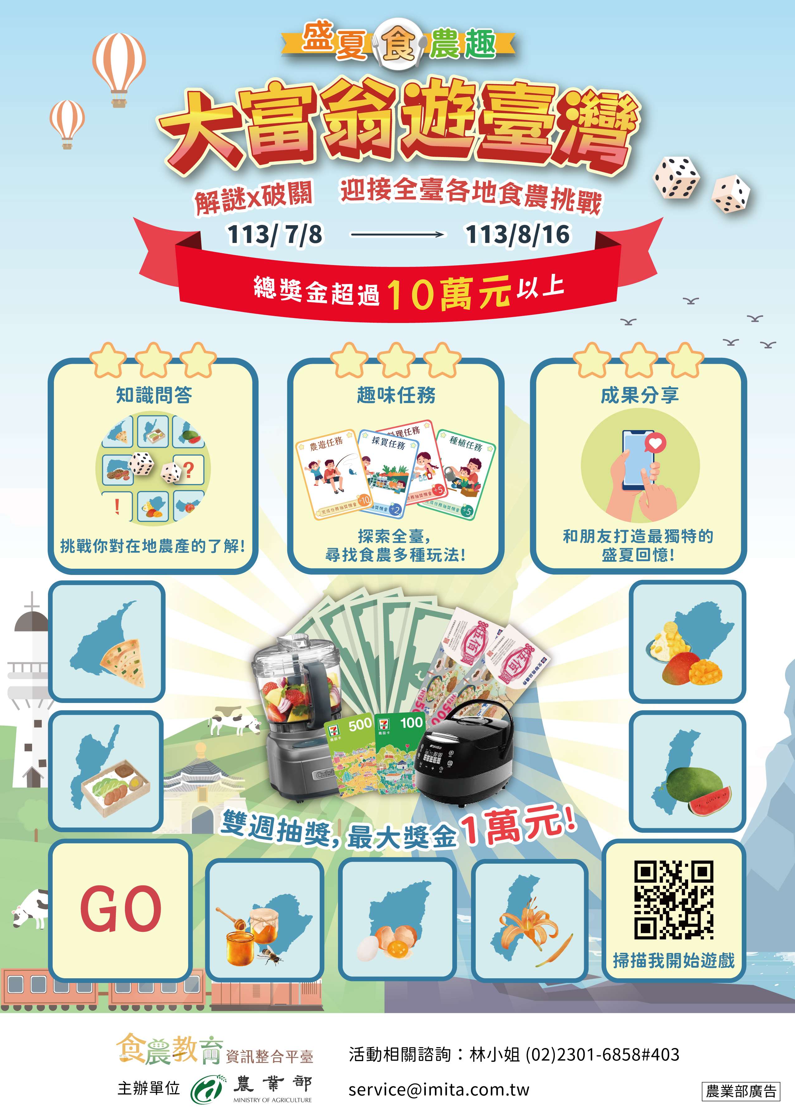 二、為促使大眾更加瞭解食農教育,農業部訂於113年7月8日至8月16日舉辦「盛夏食農趣:大富翁遊臺灣」食農教育推廣活動(網址:https://fae.moa.gov.tw/2024event/),提供食農教育相關知識問答、任務體驗與成果分享等遊戲,參與活動即可抽獎,總獎金超過10萬元,有興趣者歡迎踴躍參與。