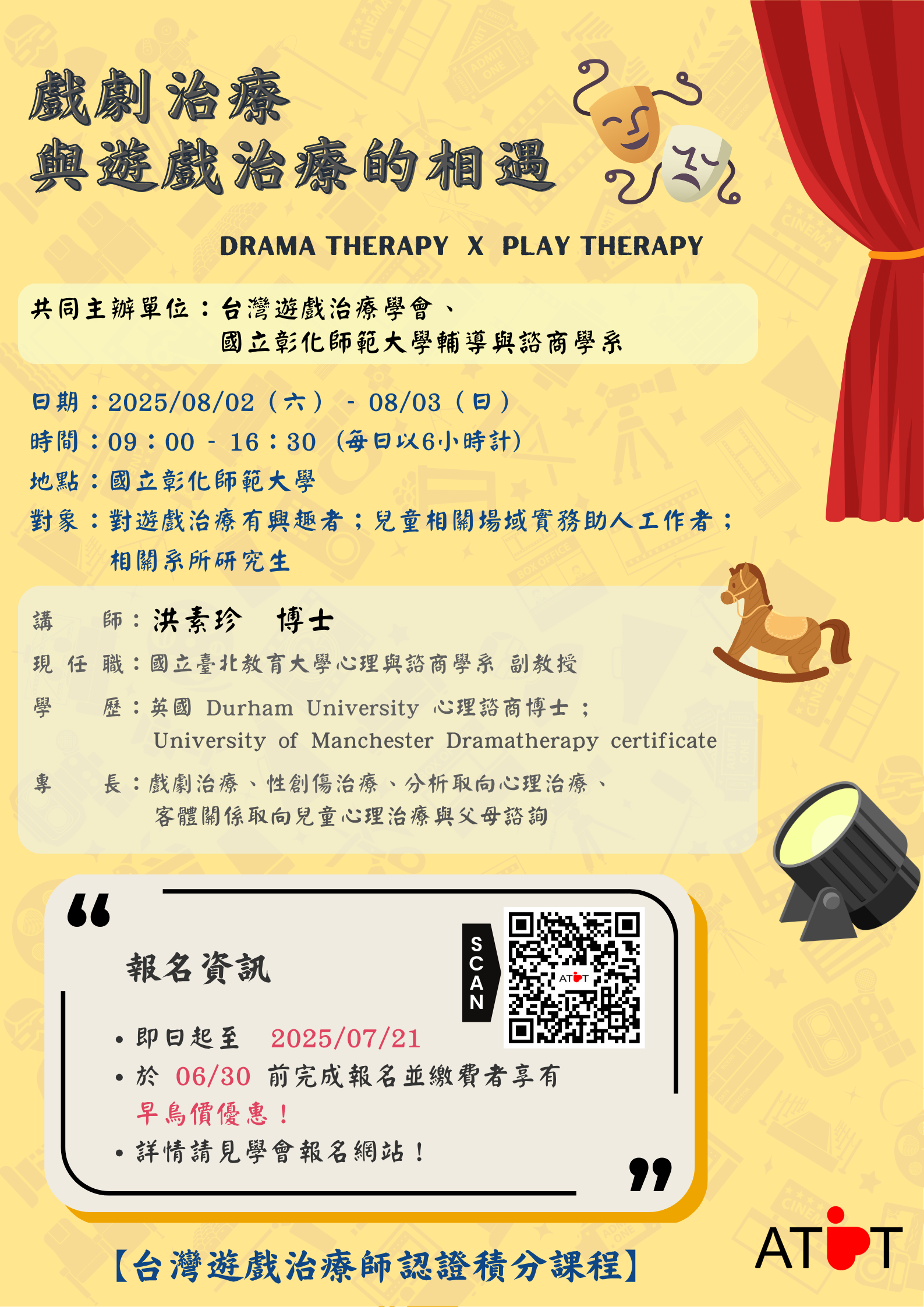 2、於06/30前完成報名並繳費者,享有早鳥優惠價!請參 考學會報名網站(https://www.atpt.org.tw/courseid-205)。