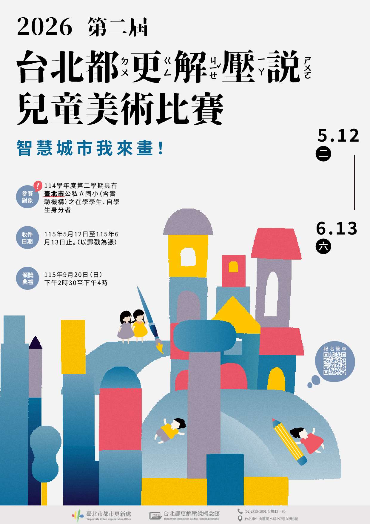 二、比賽徵件對象為本市114學年度第2學期在學之國小學生;徵件期間自115年5月12日起至115年6月13日止。本活動採團體及個人報名雙軌制,請貴校惠予透過官方網站、公佈欄等管道協助公告,並轉知校內師生踴躍參與。