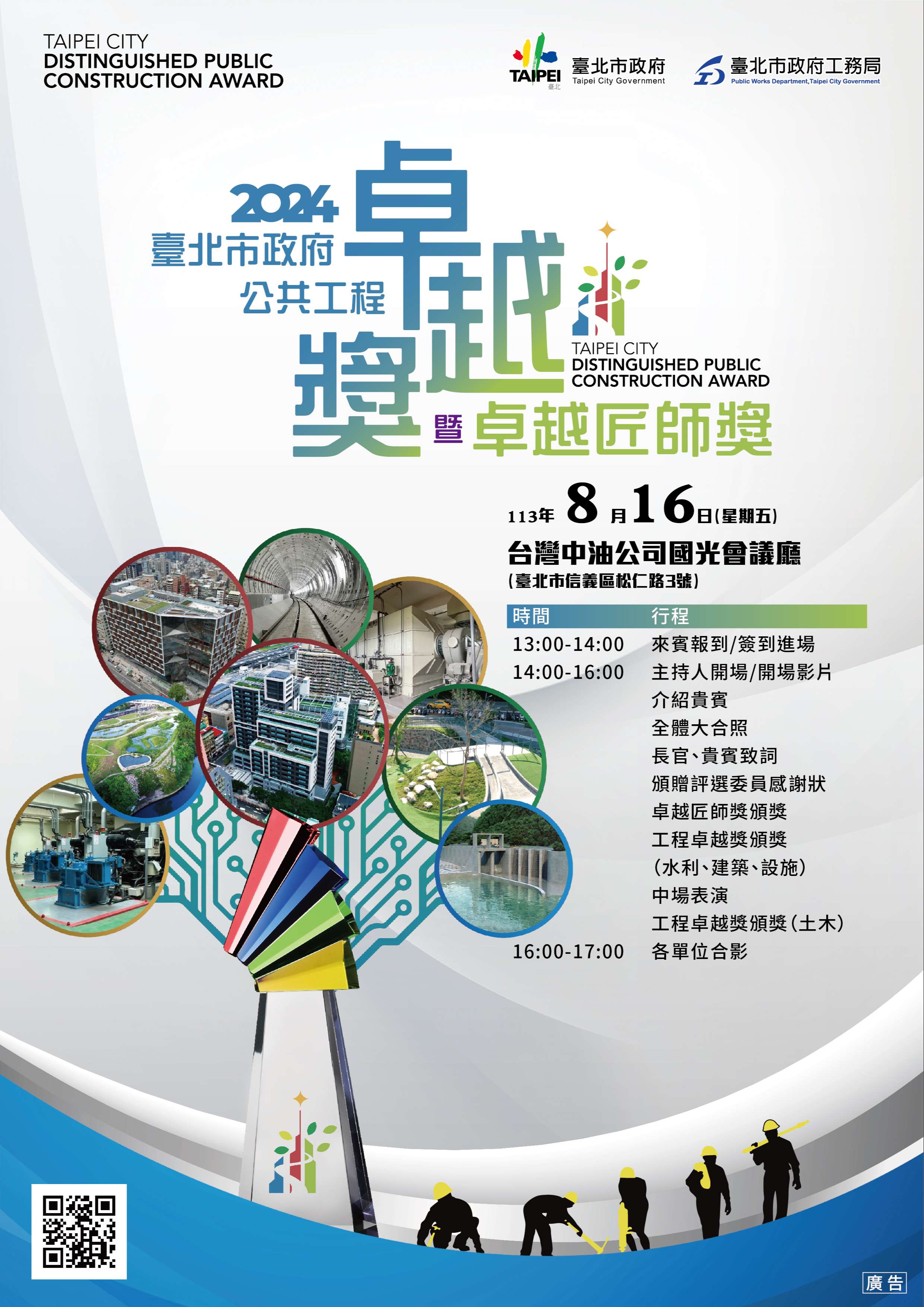 市府為精進公共工程品質、賦予工程人員榮譽與使命感並 促進良性競爭,旨揭頒獎活動訂於113年8月16日(星期 五)下午2時,假台灣中油股份有限公司—國光會議廳(臺 北市信義區松仁路3號)舉行,屆時將公開表揚公共工程卓 越優秀之工程團隊與人員。