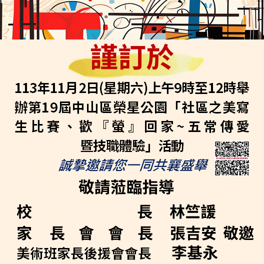 一、比賽時間:113年11月2日(星期六)早上9時至12時整。比賽地點:榮星公園內(臺北市中山區民權東路三段與龍江路口),若遇雨天照常舉行,比賽地點移至五常國中校內。