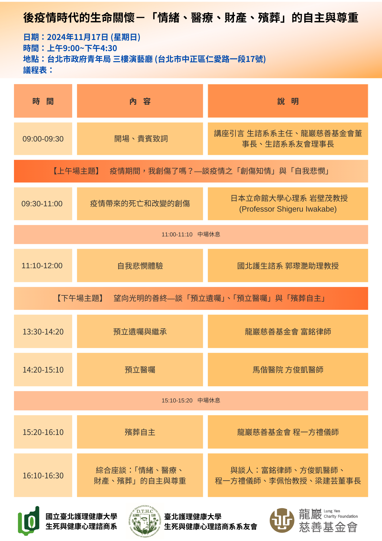 二、講座主題:「後疫情時代的生命關懷—『情緒、醫療、財 產、殯葬』的自主與尊重」。