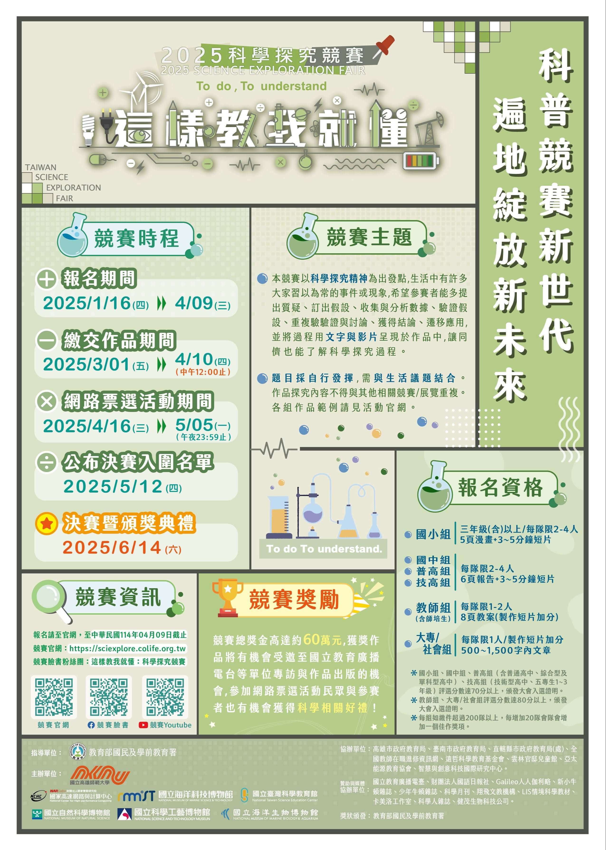 三、檢附競賽文宣海報、時程表及競賽演化歷史圖各1份,詳細 說明請參考官網,網址:http://sciexplore.colife.org. tw/。