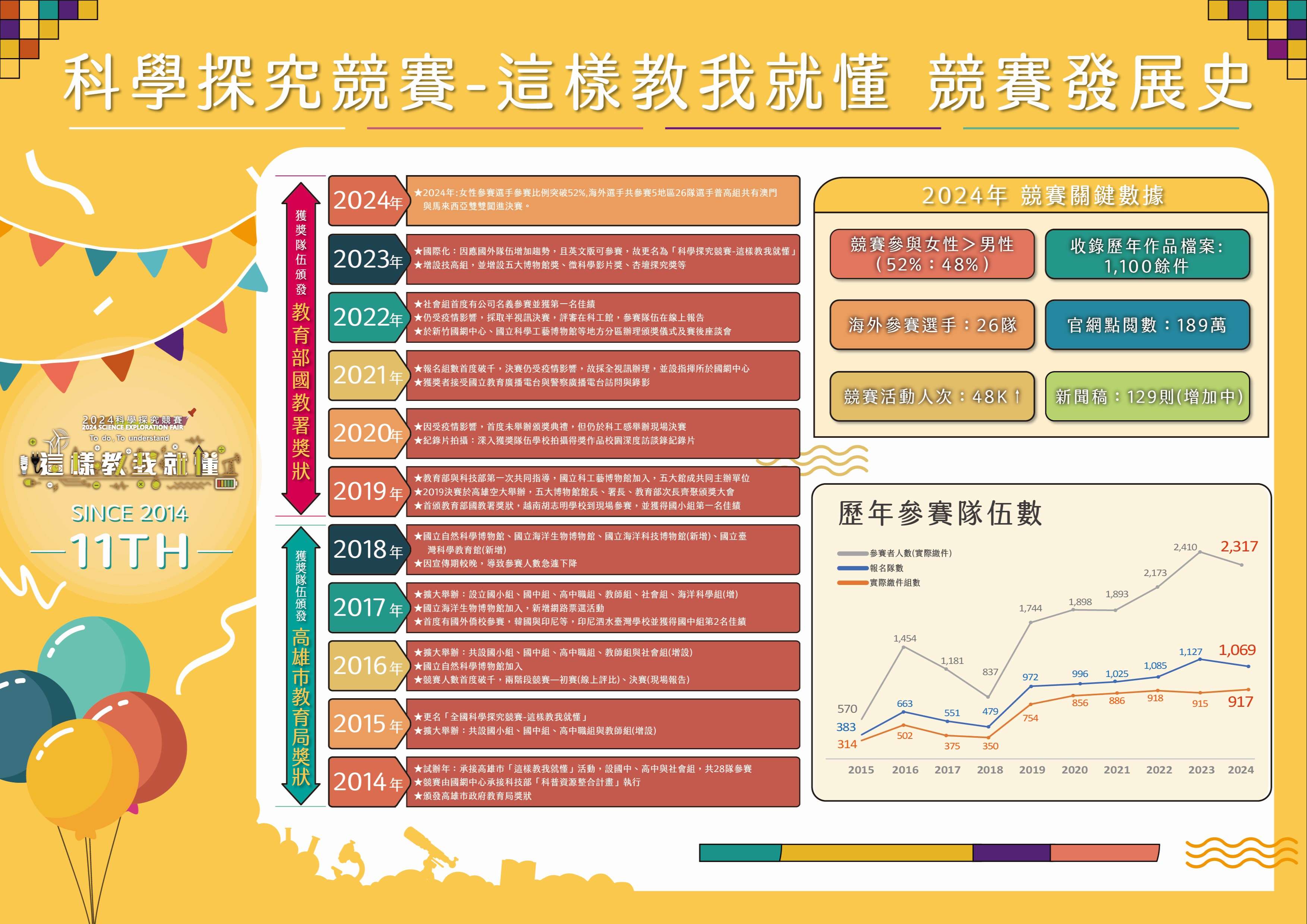 二、競賽活動自2014年起迄今已辦理10年,指導單位為教 育部國民及學前教育署,共同主辦單位為國立自然科學博物館、國立海洋生物博物館、國立海洋科技博物館及國立臺灣科學教育館、國立科學工藝博物館、國家高速網路與計算中心、國立臺灣師範大學及國立高雄師範大學。競賽 分為國小、國中、普高、技高、教師及大專/社會組。