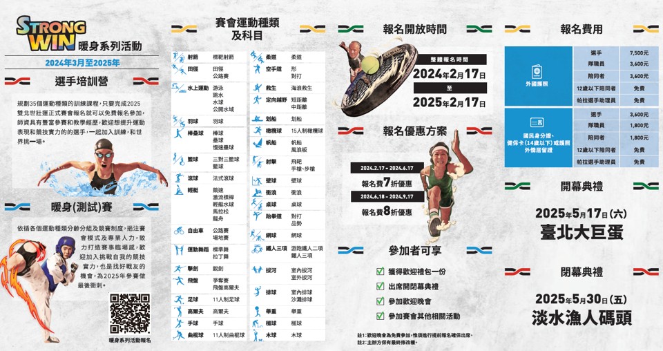 四、2025雙北世壯運在臺北,亞洲第一次,臺灣第一次,5/17-5/30,讓我們一起為選手加油,見證每一場精彩比賽,一同感受競技的熱血與感動,一起和世界挑一場!