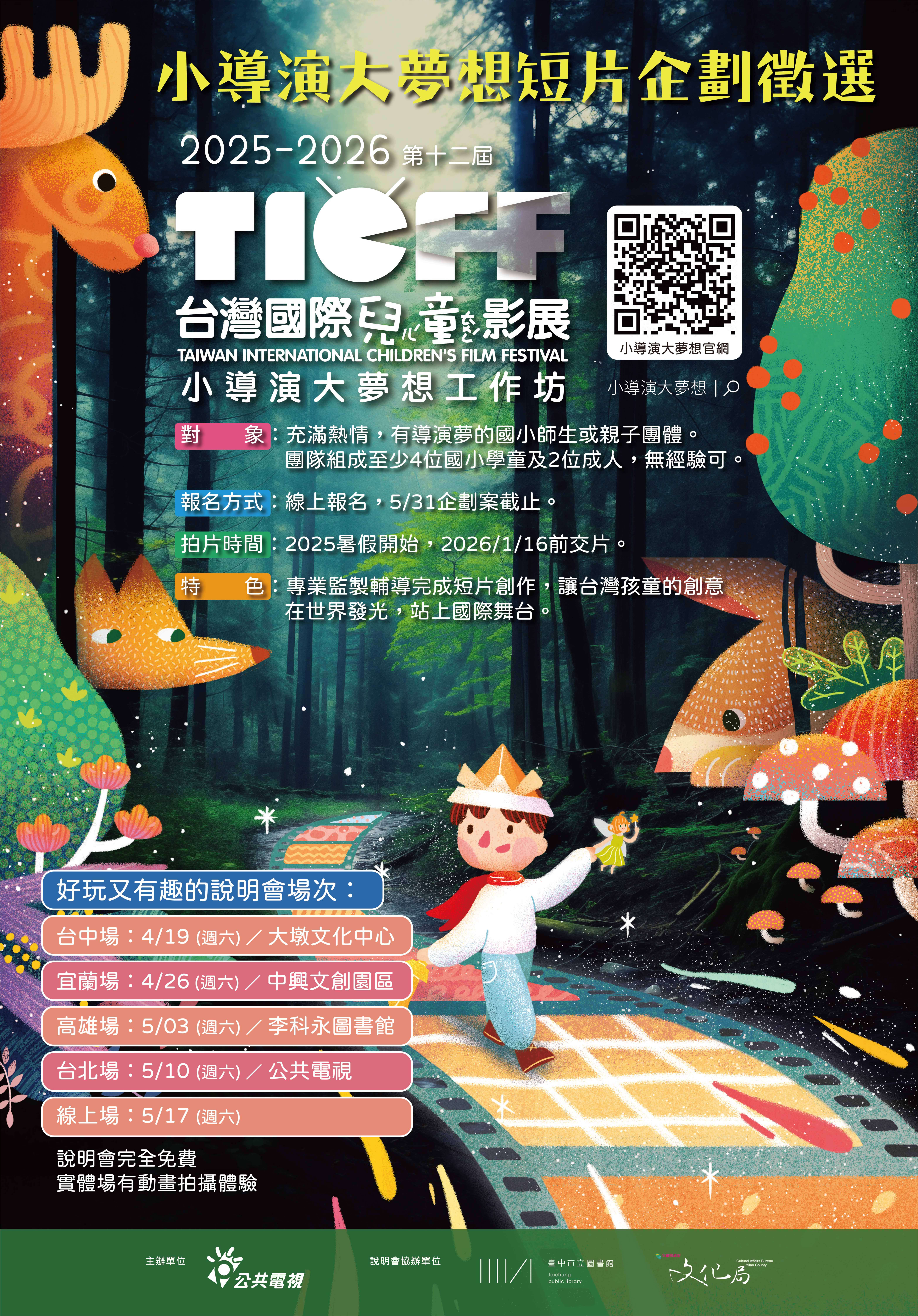 三、「兒童短片企劃案徵選」於2025/5/31截止收件,歡迎國小師生、親子團隊組隊上網報名。提出拍片企劃參加徵選,入選團隊可享整套拍片輔導資源,完成短片擇優送國際參展。相關活動細節請上活動官網 https://www.pts.org.tw/dreamer12/