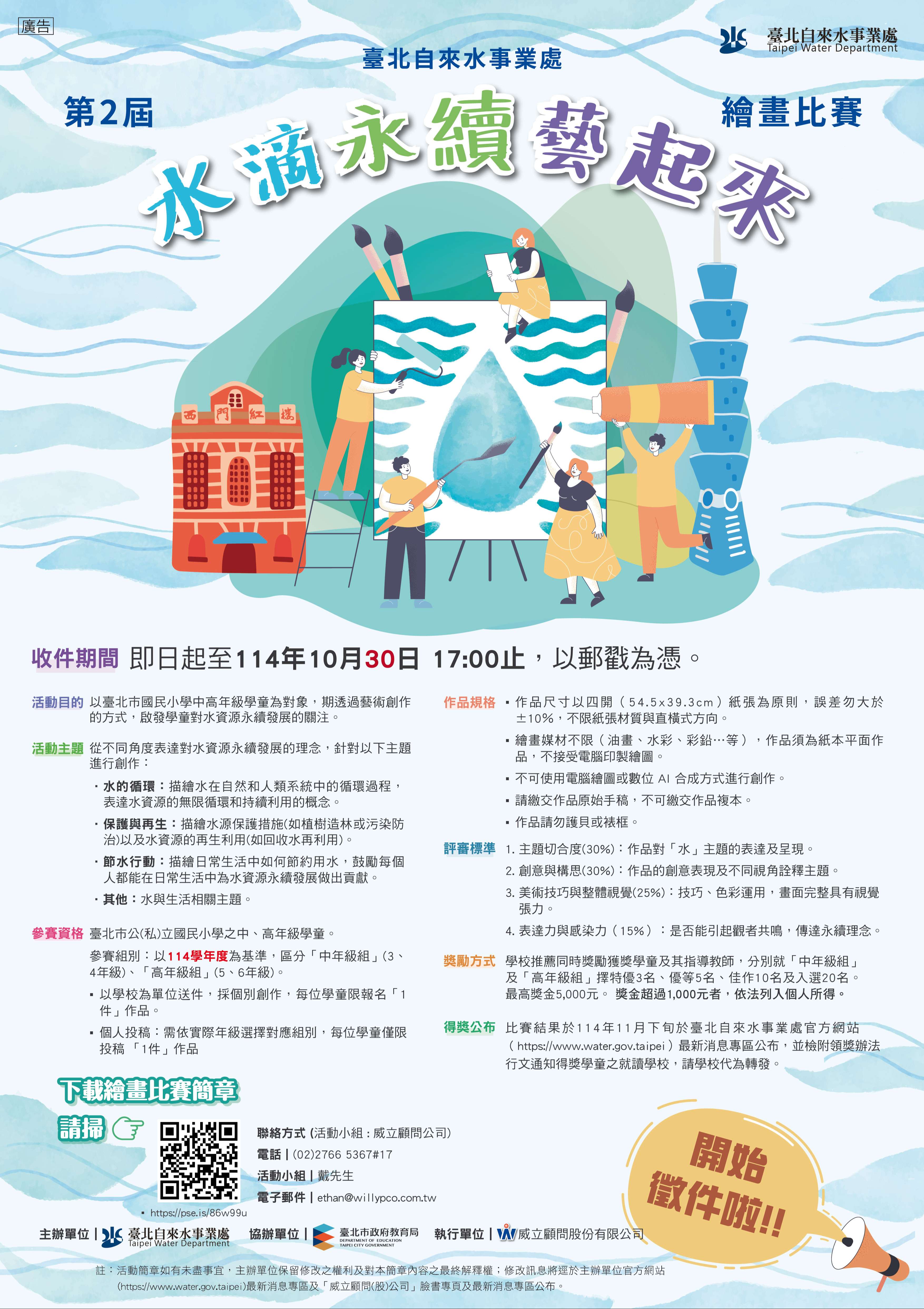 (三)郵寄:以郵戳為憑、掛號方式寄送至「臺北市松山區南京東路5段230號14樓之4,第2屆水滴永續藝起來繪畫比賽活動小組 收」,逾期不予受理。